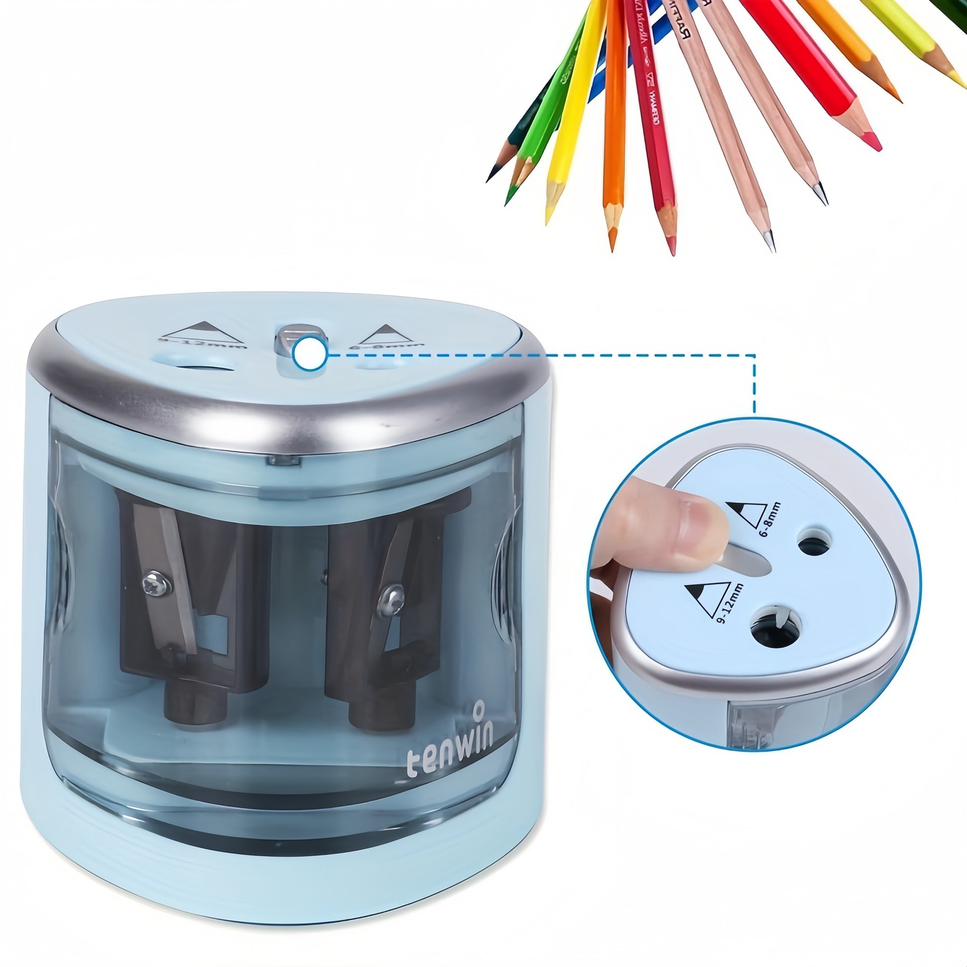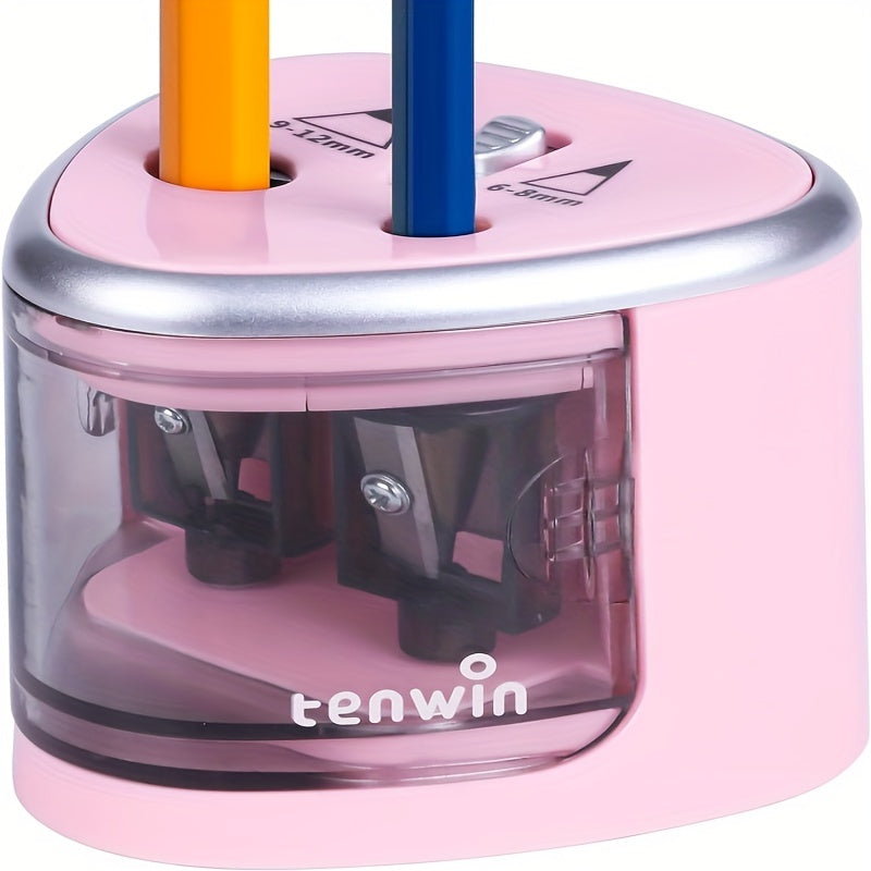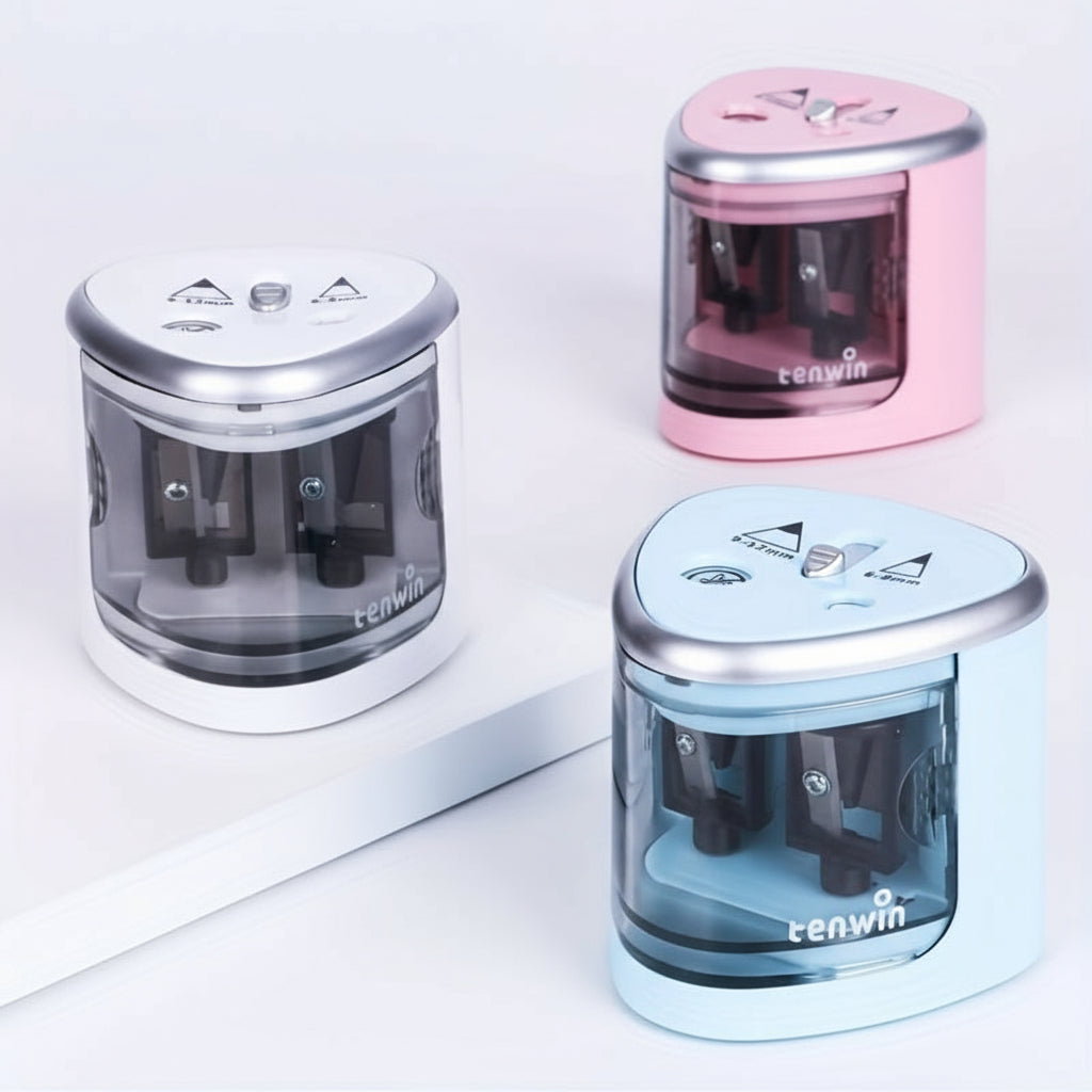 Această ascuțitoare electrică cu două orificii este concepută pentru creioane de grosimi diferite, oferind o ascuțire rapidă și precisă. Funcționează semi-automat, activându-se prin introducerea creionului și oprindu-se automat după ascuțire.