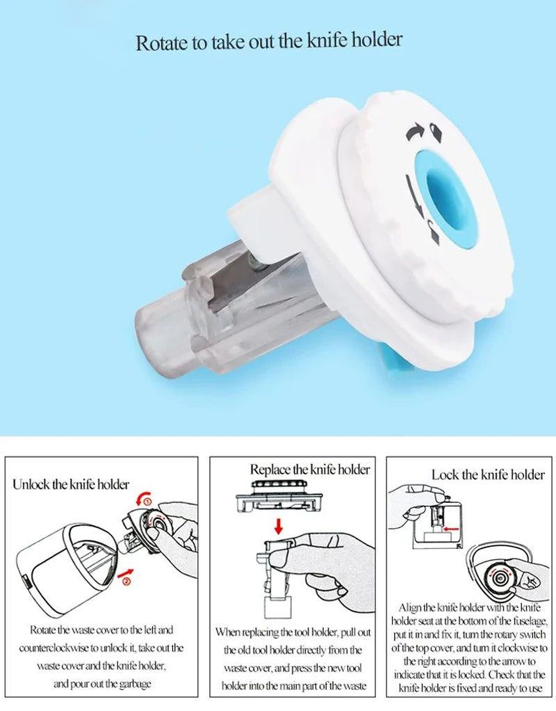 - Lama elicoidală din oțel. Rezistentă și durabilă, asigură un vârf fin și perfect de fiecare dată.